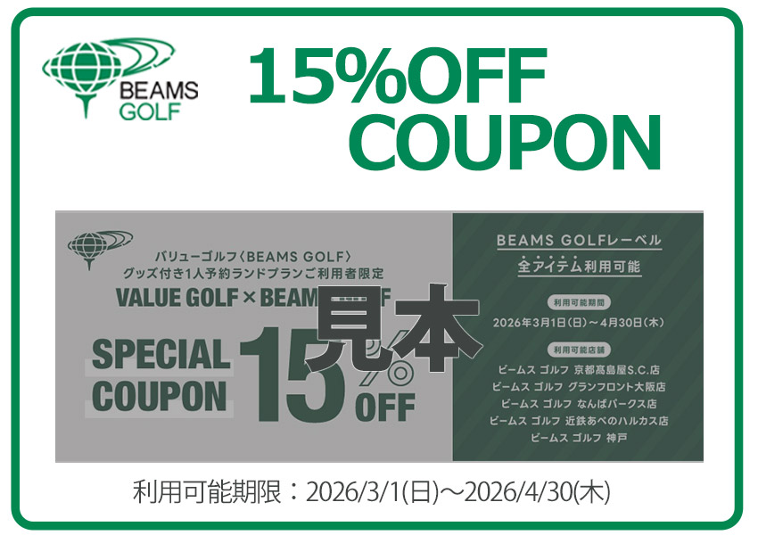 15%割引クーポンが貰える!スペシャルプランにご予約し、ご来場いただいた皆様に、ビームス ゴルフ 店舗限定の15%割引クーポンをお渡しします。欲しかったあのアイテムやお目当てのゴルフグッズをオトクに買えちゃうチャンス!