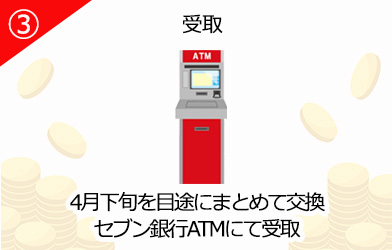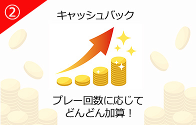 交換について | 2026年4月下旬より、プレー対象期間内の金額をまとめて交換可能となります(「セブン銀行ATM」でのみの受取) セブン銀行ATMでの受取手続きの詳細につきましては、2026/4/16以降にご登録のメールアドレスあてに順次ご案内いたします。 ※キャッシュバック受取手続きについては、GMOペイメントゲートウェイ株式会社のGMO-PG送金サービスを利用します。 |