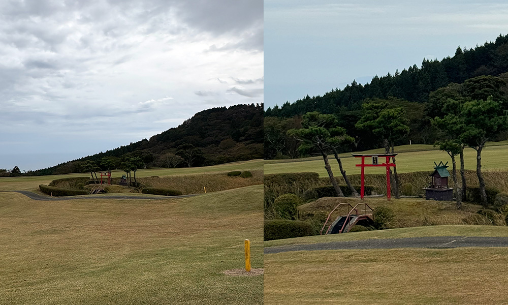 飛駒INコース11番から12番へ移動する途中の右側に、ゴルフ場外から登れる小道があり、その先には鳥居と祠が。どうやらゴルフ場がオープンする前からあるらしい。祠越しに見えるコースの写真は、まるで古くからいる神様が、ゴルファー達を見守っているようです。