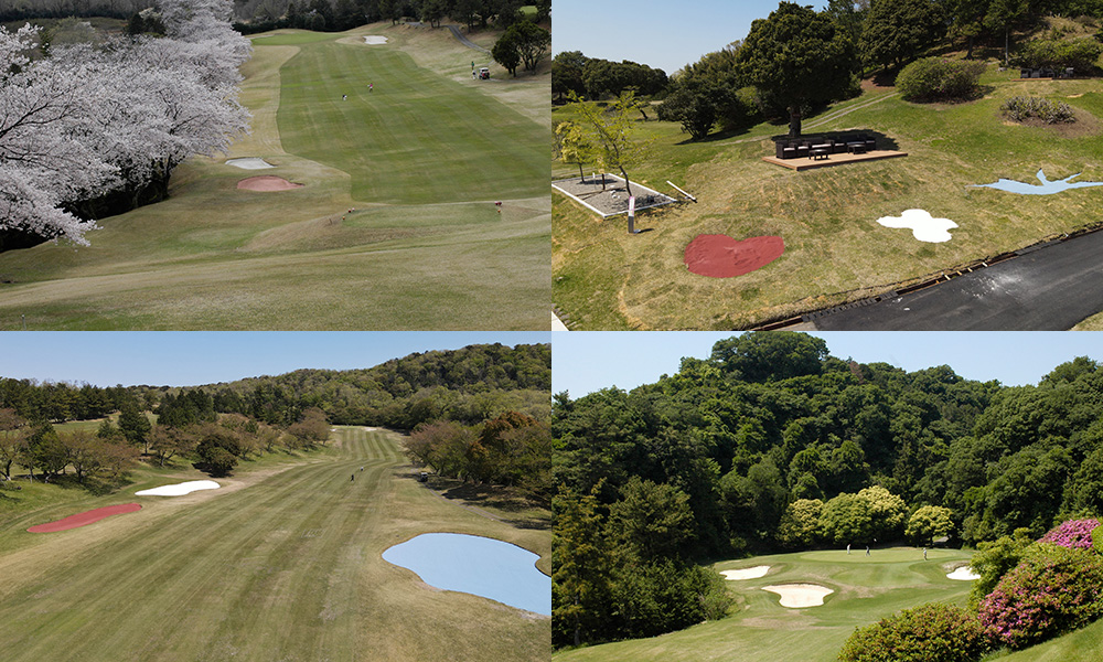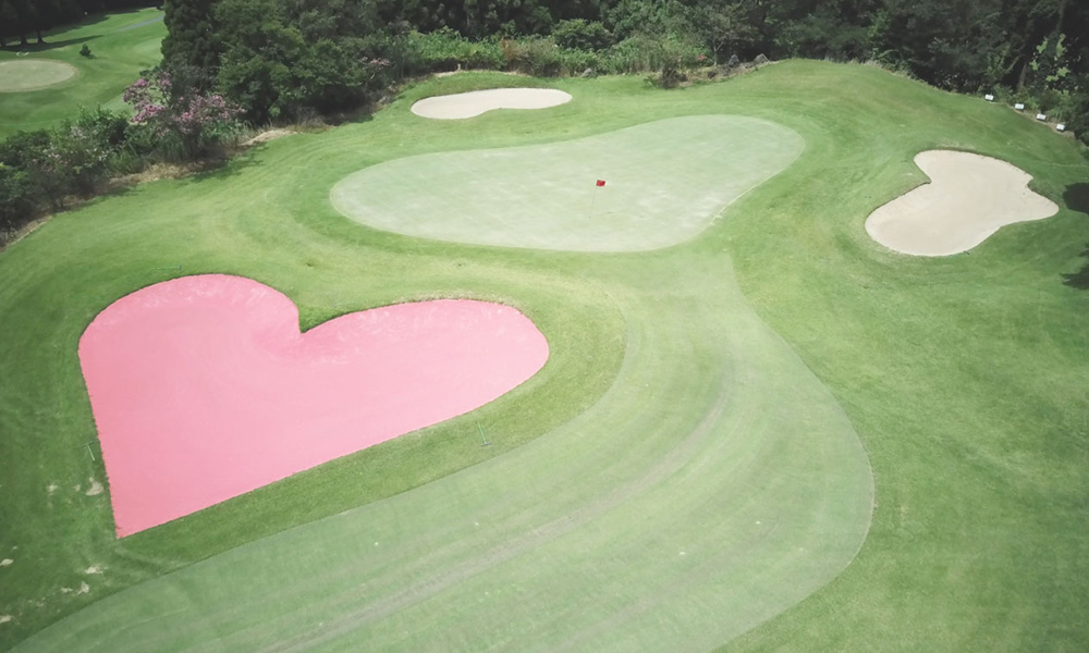 白・赤・青のカラーサンドバンカーが散りばめられたコース。中でも赤いハートのバンカーは、恋に落ちるようにボールが吸い込まれるとか?!でもご安心を、恋愛運には特に影響はありません。ゴルファーは今日も、“愛”より“アイアン”でまっすぐ勝負です。