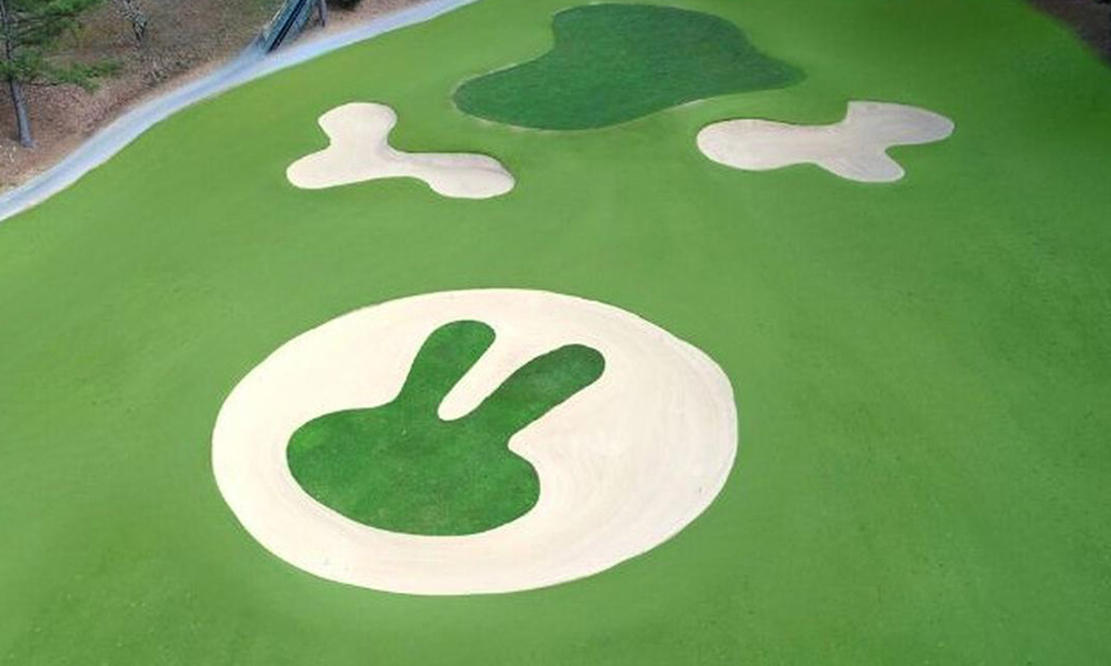 14番ホールにはエリエールGCのシンボルマークからとった通称「ラパンバンカー」がお目見え。フェアウェイのほぼど真ん中にあり戦略性を高めるために新設されたこのうさぎちゃん、かわいい顔してプレーヤーを悩ます決断を迫る存在となっているのです…。