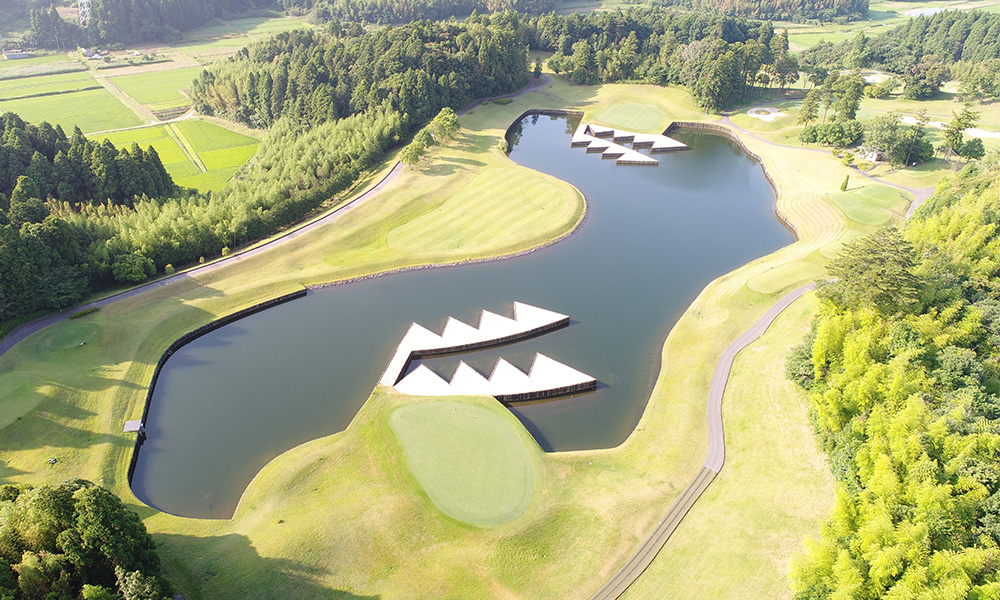 上空から見ると、池に巨大ワニが現れたのかとギョッとする波型バンカー。7番と8番ホールのグリーン近くに存在しており、一歩間違えば、パクリと飲み込まれそうなその迫力に、最後のひと打ちもドキドキ。今日も誰かがこのワニの口にヒヤリとさせられているかもしれません。